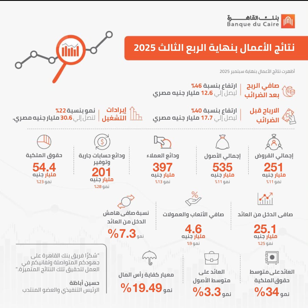 نتائج أعمال بنك القاهرة بنهاية سبتمبر 2025.. نمو إيرادات التشغيل بنسبة 22% لتصل إلى 30.6 مليار جنيه مصري. وارتفاع صافي الربح بنسبة 46% ليصل إلى 12.6 مليار جنيه مصري