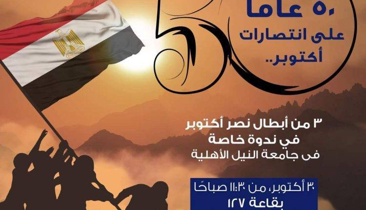 تنظم جامعة النيل الأهلية، برئاسة الدكتور وائل عقل، رئيس الجامعة، ندوة تثقيفية خاصة وذلك يوم الإثنين المقبل الموافق 30 أكتوبر الجاري، احتفالًا بمرور 50 عامًا على انتصارات أكتوبر المجيدة، وبحضور مجموعة من أبطال النصر العظيم، وذلك بالمقر الرئيسي للجامعة بمدينة الشيخ زايد.