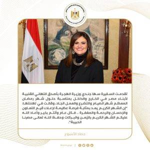 11) تقدمت السفيرة سها جندي وزيرة الهجرة بأصدق التهاني القلبية لأبناء مصر في الخارج والداخل بمناسبة حلول شهر رمضان المعظم شهر الصيام والتضرع والعمل الجاد، وقالت في تهنئتها: “إن الشهر الكريم يعد بمثابة فرصة عظيمة لإعلاء قيم التعاون والإحسان والرحمة والمغفرة .. فكل عام وأنتم بخير وأعاد الله عليكم الشهر الكريم باليُمن والبركات وحفظ الله تعالى مصرنا الحبيبة”.