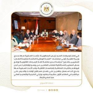 1) في إطار توجيهات السيد رئيس الجمهورية، ترأست السفيرة سها جندي وزيرة الهجرة، أولى اجتماعات “اللجنة الوطنية الدائمة لمتابعة الطلاب المصريين بالخارج” لدراسة مدى ملائمة اتخاذ الإجراءات القانونية لوضع بعض المعايير الاستثنائية للطلاب العائدين من روسيا وأوكرانيا، من أجل قبولهم بالكليات المناظرة بالجامعات الأهلية، وقد أكدت السفيرة سها جندي أننا سنعمل جاهدين على ضمان مستقبل أولادنا، والحرص على حياتهم في المقام الأول، مشيدة بجهود وزارتي الخارجية والتعليم العالي منذ اندلاع الأزمة.