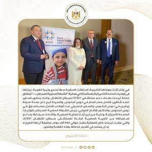 3) في إطار ثالث جولاتها الخارجية، استهلت السفيرة سها جندي وزيرة الهجرة، زيارتها إلى الولايات المتحدة الأمريكية بالمشاركة في فعالية “الشبكة المصرية للسرطان ECN” لإطلاق حملة تبرعات بهدف دعم مستشفى 57357 لسرطان الأطفال، وذلك بحضور السفير أحمد شاهين، قنصل مصر العام في لوس أنجلوس، والسيدة فرح خان عمدة مدينة إيرفين في لوس أنجلوس، والسفير الحسيني عبد الوهاب قنصل مصر السابق في لوس أنجلوس، والدكتور هشام الصيفي، رئيس الشبكة المصرية للسرطان بالولايات المتحدة الأمريكية، ونخبة من أبرز أبناء الجالية المصرية، وأشادت سيادتها بما تم استعراضه عن التجربة المصرية الرائدة لمستشفى سرطان الأطفال 57357، والتي جذبت تبرعات خلال الفعالية بلغت حوالي 600 ألف دولار، مضيفة أن هذا الصرح لا بُد أن يستمر في تقديم خدماته بهذه الكفاءة والتميز.