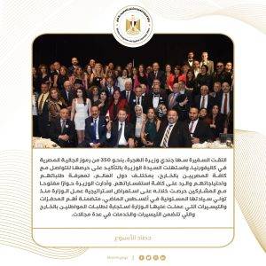 5) التقت السفيرة سها جندي وزيرة الهجرة، بنحو ٣٥٠ من رموز الجالية المصرية في كاليفورنيا، واستهلت السيدة الوزيرة بالتأكيد على حرصها للتواصل مع كافة المصريين بالخارج، بمختلف دول العالم، لمعرفة طلباتهم واحتياجاتهم والرد على كافة استفساراتهم. وأدارت الوزيرة حوارًا مفتوحا مع المشاركين حرصت خلاله على استعراض استراتيجية عمل الوزارة منذ تولي سيادتها المسئولية في أغسطس الماضي، متضمنة أهم المحفزات والتيسيرات التي عملت عليها الوزارة استجابة لطلبات المواطنين بالخارج والتي تتضمن التيسيرات والخدمات في عدة مجالات.