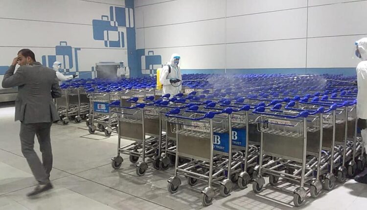 للحد من انتشار فيروس كورونا و تشمل اعمال التعقيم مداخل ومخارج صالات السفر والوصول وكاونترات الجوازات وسيور الحقائب وعربات نقل الأمتعة وأماكن الإنتظار الخاصة بالركاب والمستقبلين والمودعين ودورات المياه.