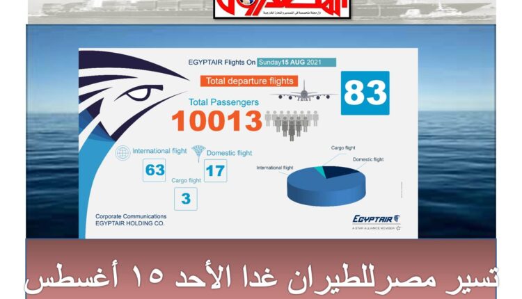 تسير مصرللطيران غدا الأحد ١٥ أغسطس ٨٣ رحلة جوية بمعدل ٦٣ رحلة دولية إلى كل من بغداد، عمان، إربيل، دبي، ندجامينا، لاجوس، تونس، الدوحه، أثينا، مدريد، دوسلدورف، لندن، نيويورك، ميلانو، روما، أبوجا، باريس، جنيف، إسطنبول، امستردام، فرانكفورت، كوبنهاجن، برلين، بروكسل، موسكو، أبوظبي، فيينا، ميونيخ، البحرين، الخرطوم، بيروت، الشارقة، نيروبي، عنتيبي، أديس أبابا، أسمرة، و١٧ رحلة داخلية الى كل من شرم الشيخ والغردقة والأقصر وأسوان وسوهاج ومرسى علم، و٣رحلات شحن جوي تنقل جميع هذه الرحلات ١٠٠١٣ راكبا .